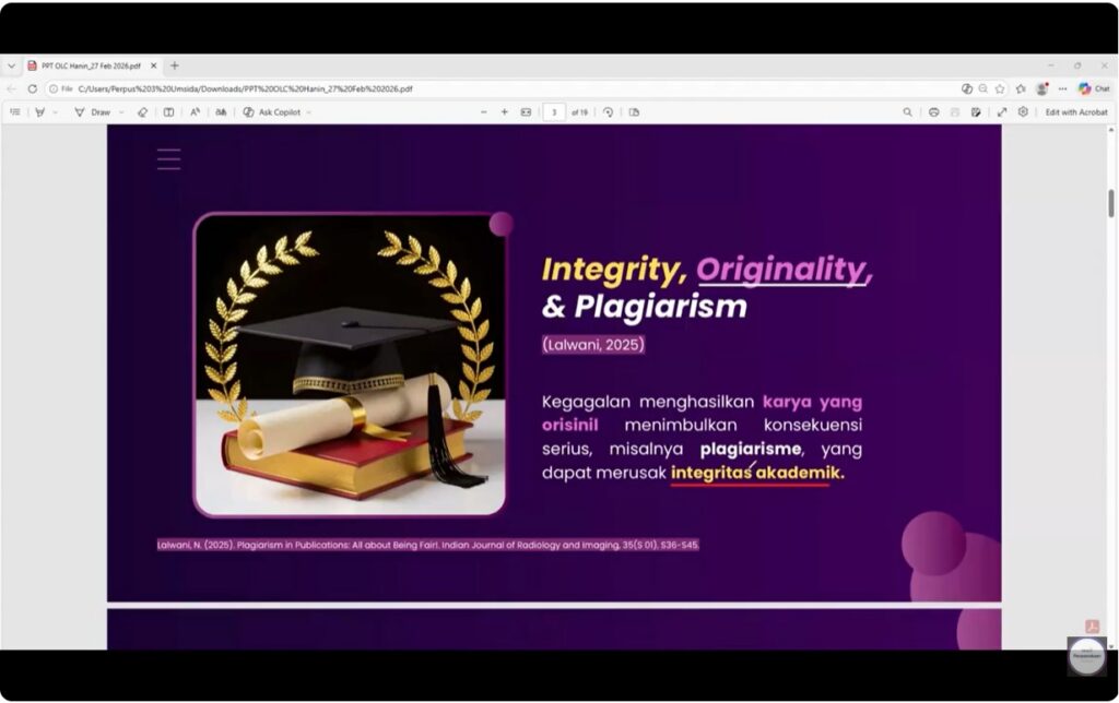 Program literasi ini menghadirkan Haninindia A. Rosanti, S.IIP., pustakawan UMSIDA, sebagai narasumber yang akan membagikan pengetahuan dan pengalaman terkait pentingnya menjaga integritas akademik dalam proses penulisan dan publikasi karya ilmiah.